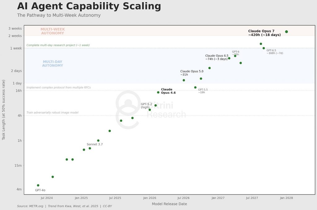 Hoy, los agentes de IA manejan tareas de investigación y desarrollo que duran muchas semanas. La exponencial pasó por encima de nuestras concepciones de lo que era posible, aunque cada año profesores de Wharton intentaran ajustar los datos a una nueva sigmoide.