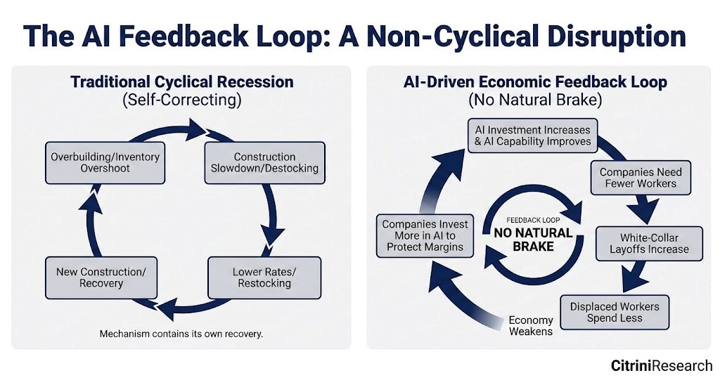 El primer bucle de retroalimentación negativa fue en la economía real: la capacidad de la IA mejora, la nómina se reduce, el gasto se debilita, los márgenes se comprimen, las empresas compran más capacidad, la capacidad mejora. Luego se volvió financiero: el deterioro de ingresos impactó en las hipotecas, las pérdidas bancarias endurecieron el crédito, el efecto riqueza se quebró, y el bucle se aceleró. Y ambos han sido agravados por una respuesta de política insuficiente de un gobierno que, francamente, parece confundido.