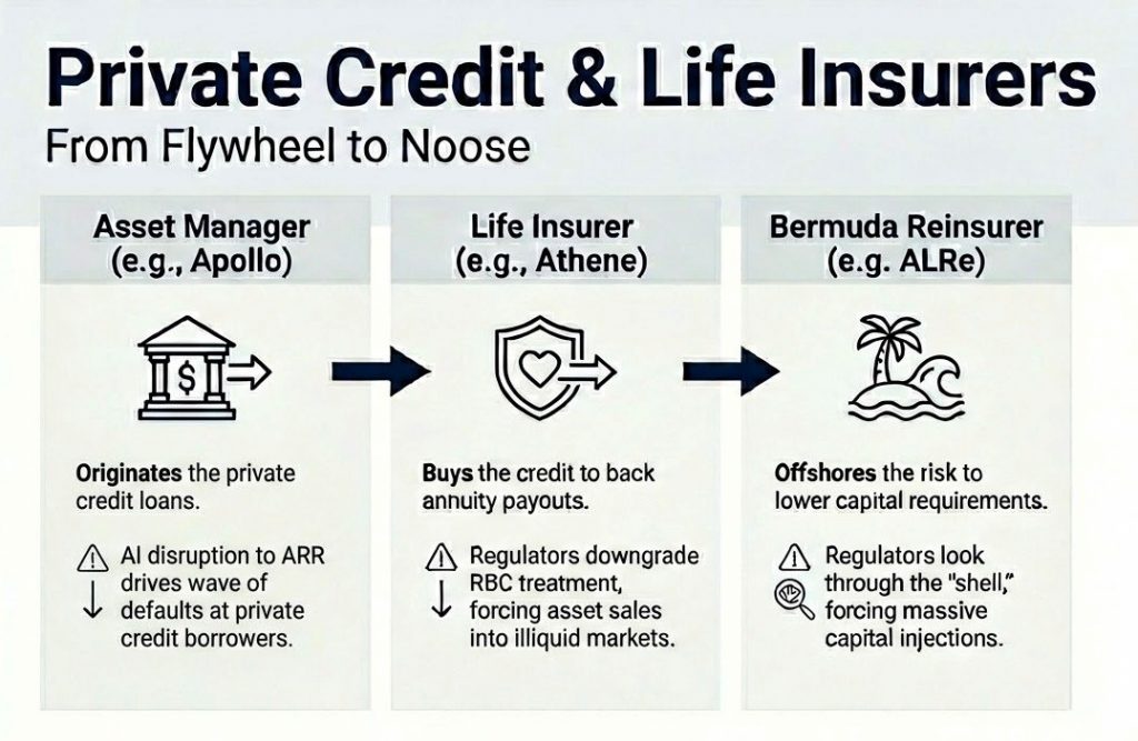 En comparación con el sistema bancario, los reguladores de seguros habían sido dóciles —incluso complacientes—, pero esto fue la llamada de atención. Ya preocupados por la concentración en crédito privado en aseguradoras de vida, comenzaron a endurecer el tratamiento de capital de estos activos. Eso obligó a las aseguradoras a levantar capital o vender activos, ninguna de las dos opciones viable en condiciones atractivas en un mercado que ya se estaba congelando.