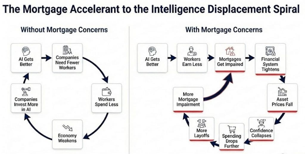 Era un bucle de retroalimentación negativa sin freno natural. La espiral de desplazamiento de la inteligencia humana. Los trabajadores de cuello blanco vieron deteriorarse estructuralmente su capacidad de generar ingresos (y, racionalmente, su gasto). Sus ingresos eran la base del mercado hipotecario de 13 billones de dólares, lo que obligó a los suscriptores a reevaluar si las hipotecas prime seguían siendo seguras.
